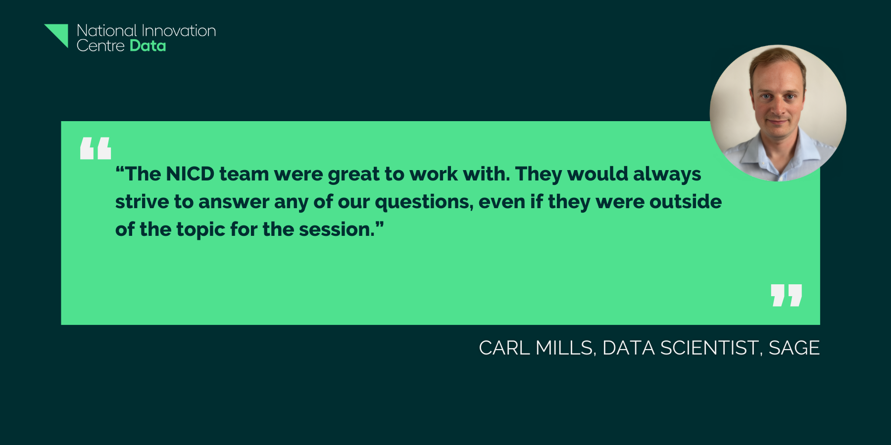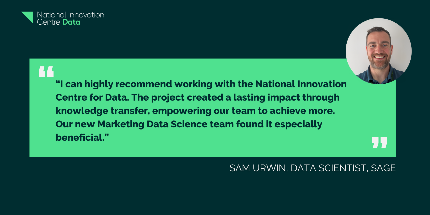 Sam Urwin is a Data Scientist at Sage, “NICD helped with the whole process end-to-end, from building and deploying a machine learning model to showing us how to do things properly.”